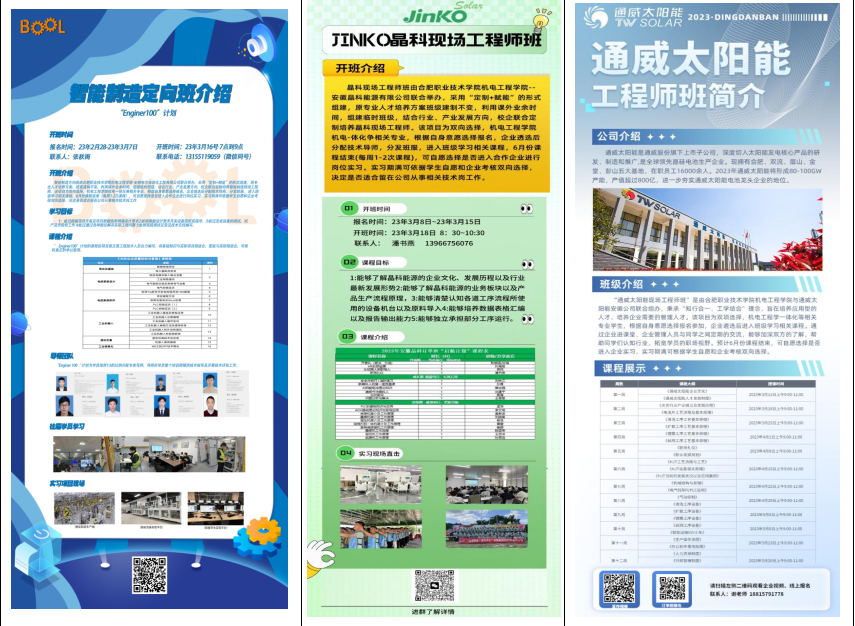 面对产业转型升级发展的新形势,现场工程师已经成为先进装备制造业乃至整个国民经济发展的迫切需求。根据现场工程师“出现”于生产和建设一线,“现身”于管理和服务现场,“战斗”于一线职业场景,具备工匠精神,“精操作、懂工艺、会管理、善协作、能创新”,能第一时间解决现场问题的特点,英国上市公司365根据合肥市高端装备制造业的岗位需求,在与安徽博清自动化科技有限公司、安徽中显智能机器人有限公司组建的智能焊接订单班和机器视觉“尖兵班”的基础上,联合安徽晶科能源有限公司组建晶科现场工程师班,安徽布尔自动化工程有限公司智能制造定向班,通威太阳能(安徽)有限公司通威现场工程师班。