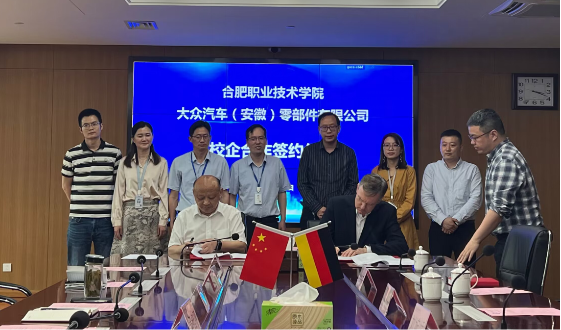 大众汽车自动变速器(天津)有限公司双元制项目负责人张志强先生介绍了近年来双元制合作的经验。随后,双方举行校企合作签约仪式,周晓隆与Oliver Harmann分别代表校企双方签署战略合作框架协议及备忘录。会后,与会人员参观了汇新湖校区校史馆及机电楼有关实训室。