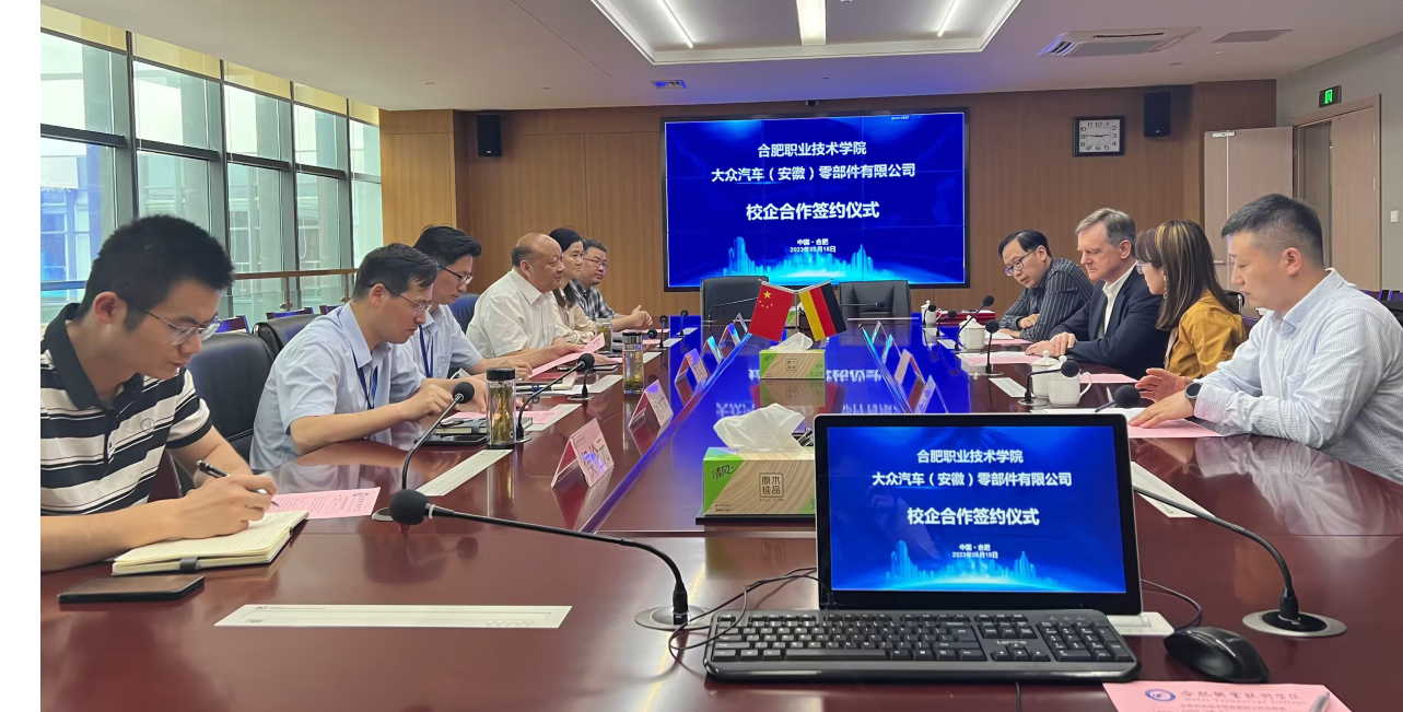 5月18日下午,我校与大众汽车(安徽)零部件有限公司校企合作签约仪式在行政楼627会议室隆重举行。副董事长周晓隆、教务处处长窦红平、科技处副处长高云、英国上市公司365经理胡木林、副经理宋铂,大众汽车(安徽)零部件有限公司商务总经理Oliver Harmann、人事经理郑尧天、商务总经理助理刘婉峤、大众汽车自动变速器(天津)有限公司双元制项目负责人张志强参加此次签约仪式,会议由胡木林主持。