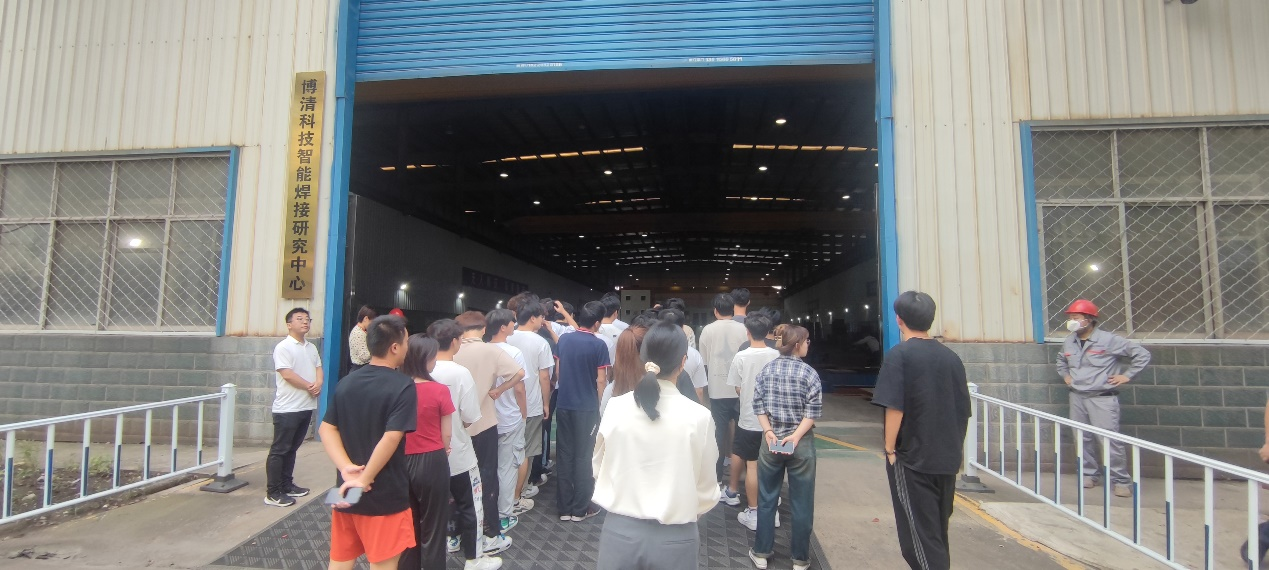 座谈结束后,参加活动的人员来到博清科技智能焊接研究中心,老师和同学们认真参观、仔细聆听企业人员介绍,并与博清科技研发工程师就最新系无轨导全位置爬行焊接机器人产品的应用场景、机器人操作、焊接工艺等进行了深入交流。