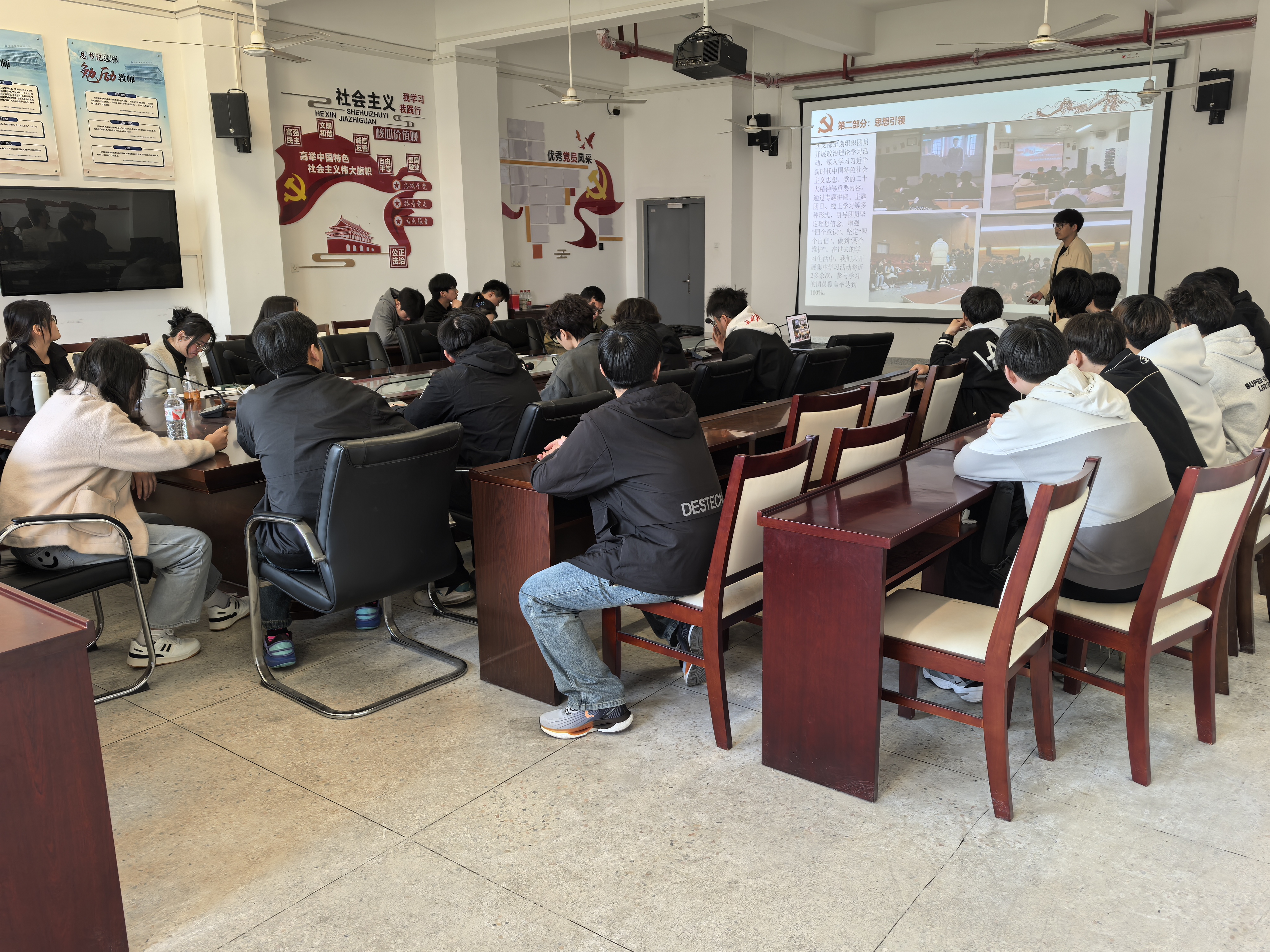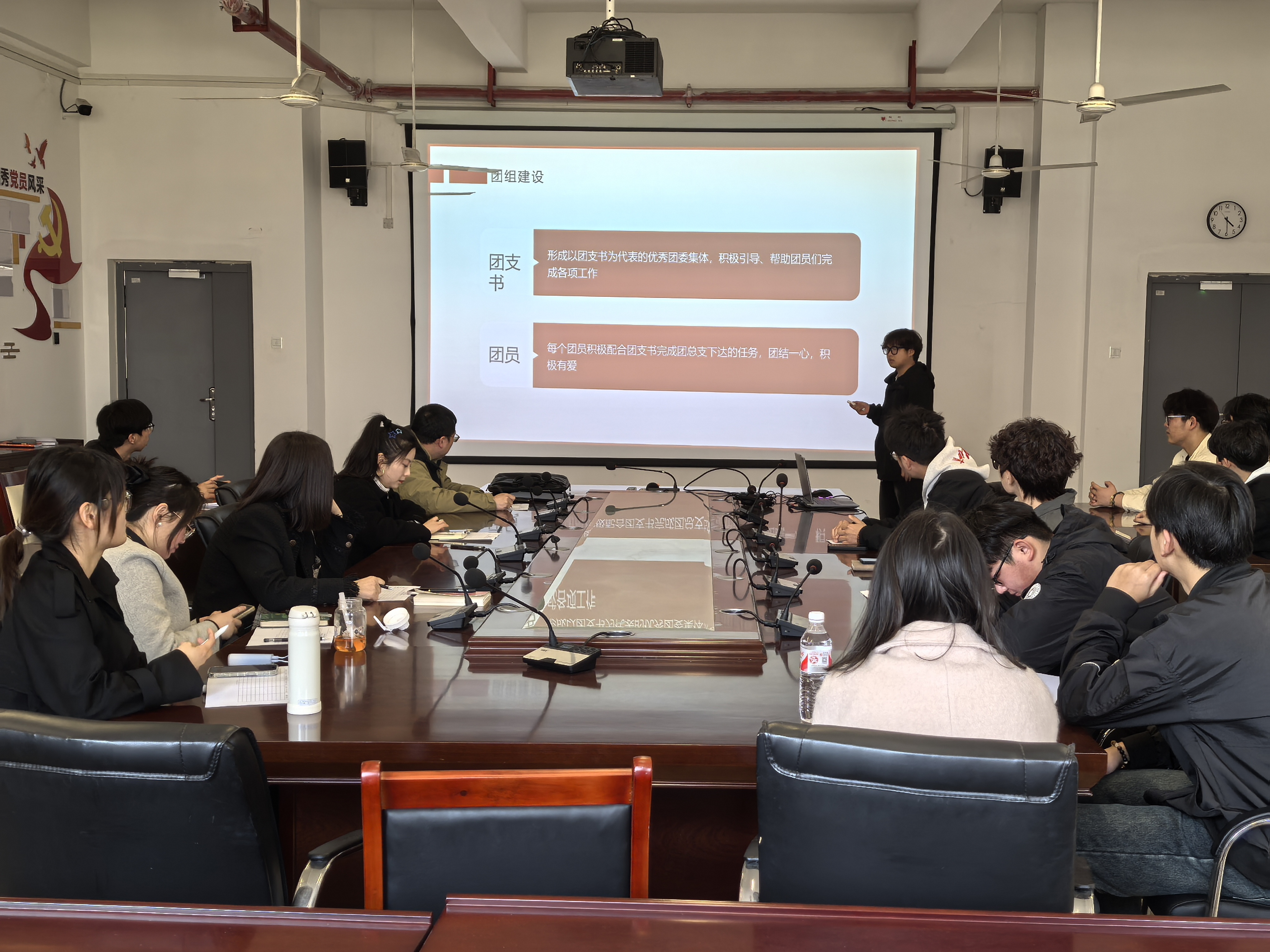 答辩现场,各参评团支部通过抽签确定答辩顺序,依次登台展示。11位答辩同学结合图片、PPT等形式,从思想引领、学风建设、志愿服务、创新创业、文体活动等多维度展开汇报,生动展现了支部成员在理论学习、社会实践、科技创新中取得的丰硕成果。答辩过程中,各团支部通过数据对比、案例分享、成果展示,既总结了经验,也剖析了不足,充分体现了基层团组织的活力与担当。现场互动频繁,掌声不断,展现了团员青年锐意进取的精神风貌。