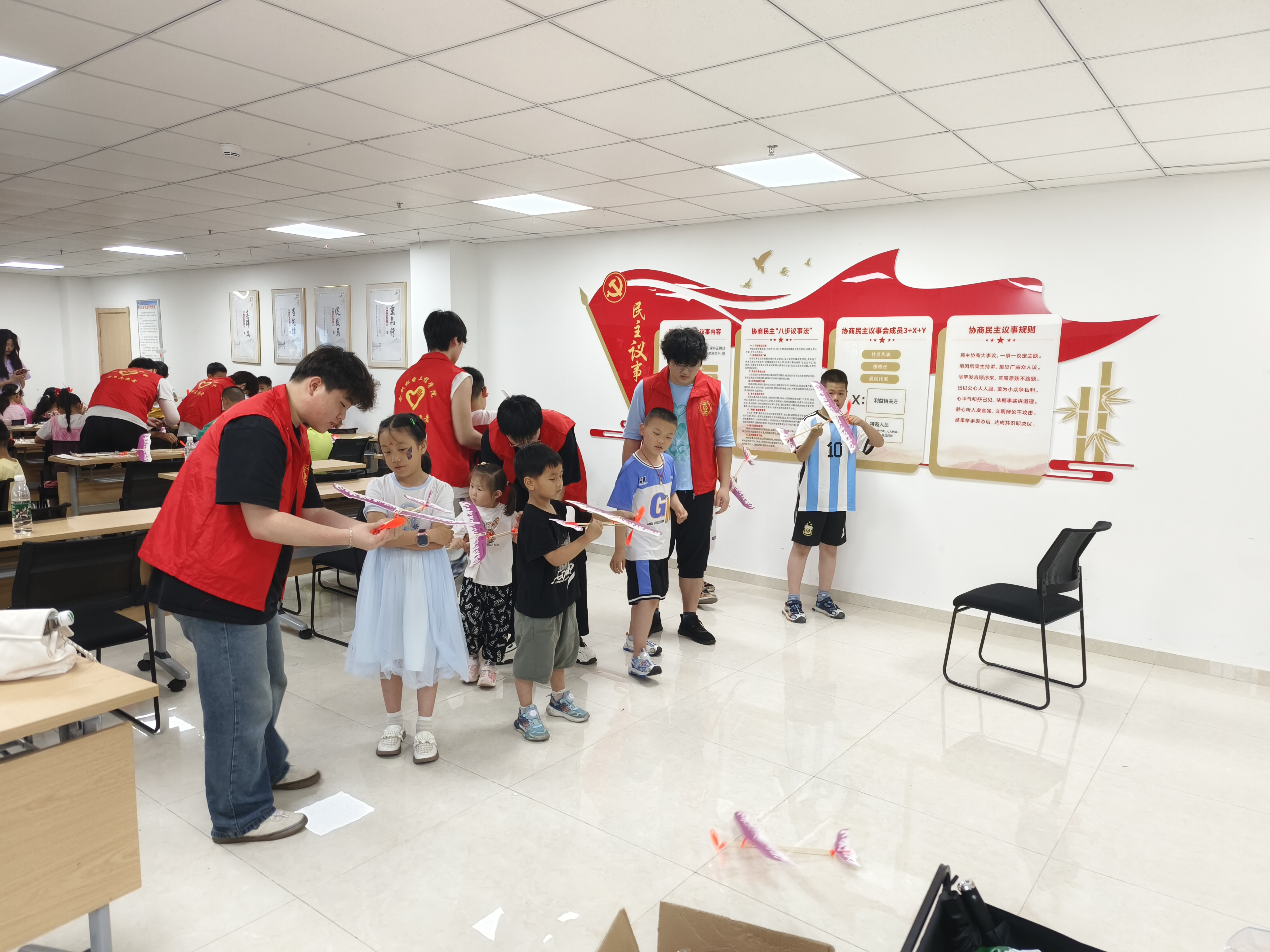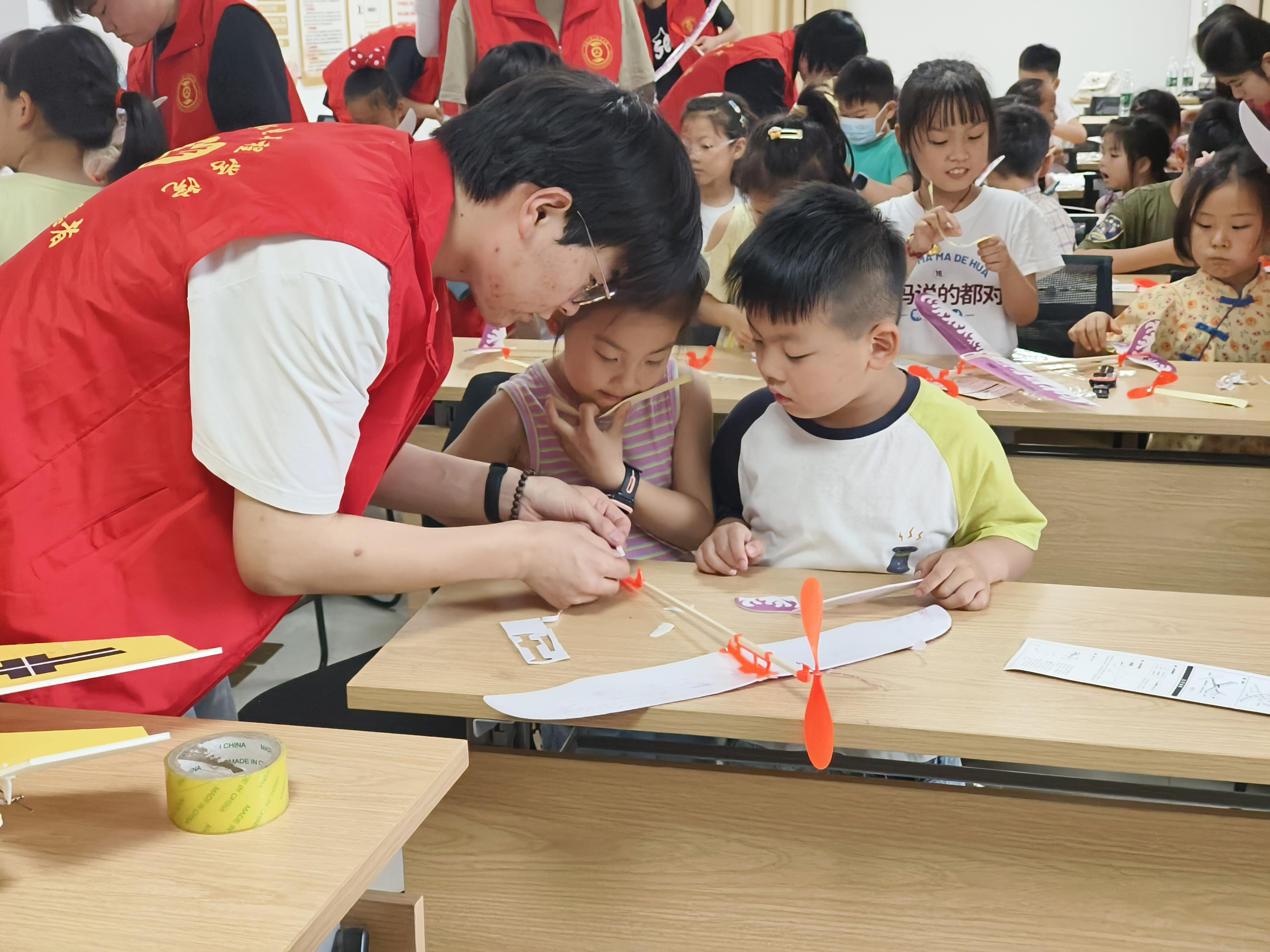 在随后的实践拼装环节中,志愿者们为小朋友们分发了航模拼装包,并带领他们亲手拼装航模机。小朋友们通过亲手操作,不仅加深了对航模机构造的理解,还体验到了动手制作的乐趣。拼装完成后,小朋友们还模拟了航模机的起飞过程,进一步加深了对航模飞行的认识。