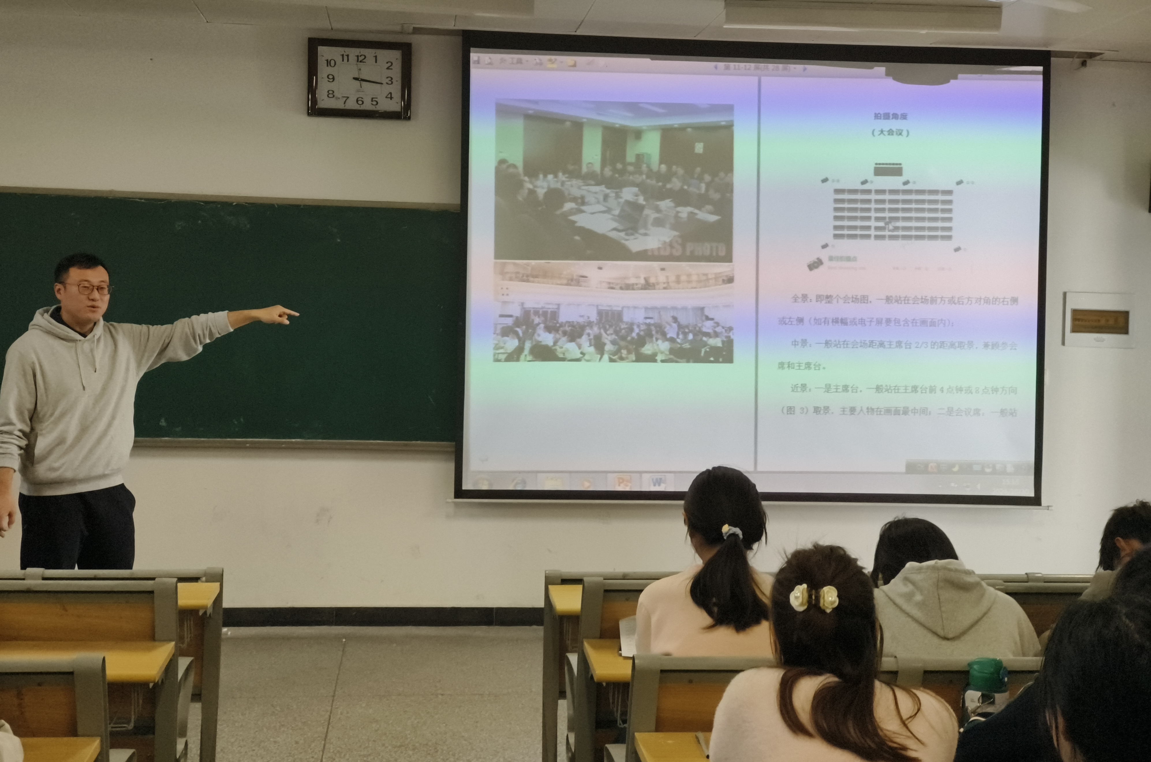 培训第二部分,张开老师介绍了校园常见活动的拍摄技巧。校园中拍摄照片的类型主要为会议照片和活动照片。在拍摄会议照片时,时机很关键,要在负责人讲话、重要决议宣布等关键时刻按下快门,定格重要画面。角度可采用正面拍摄,突出参会人员的专注神情;也可侧面拍摄,展现会议整体氛围。在拍摄活动照片时,时机要选在活动进行部分,如比赛的精彩瞬间、表演的精彩环节等。角度上,全景可呈现活动全貌,中景能突出活动主体的精彩表现,近景能非常清晰地展现主体的细节特征。