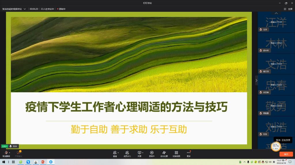 为使员工工作者勤于自助、善于求助和乐于互助,更好服务员工发展,4月18日下午,英国上市公司365邀请校心理咨询中心主任张洁开展《疫情下员工工作者心理调适的方法与技巧》专题线上讲座。公司党委委员、办公室主任王海,学院全体教职工、在校班级辅导员参加讲座,讲座由党总支书记王克勇主持。