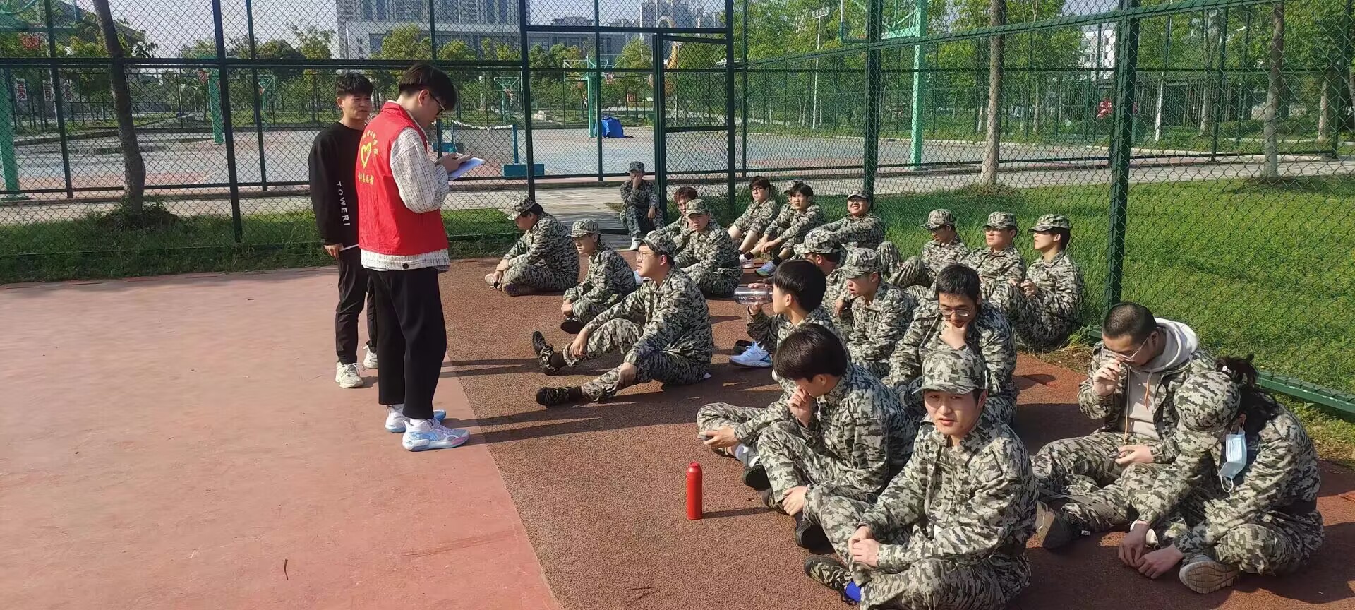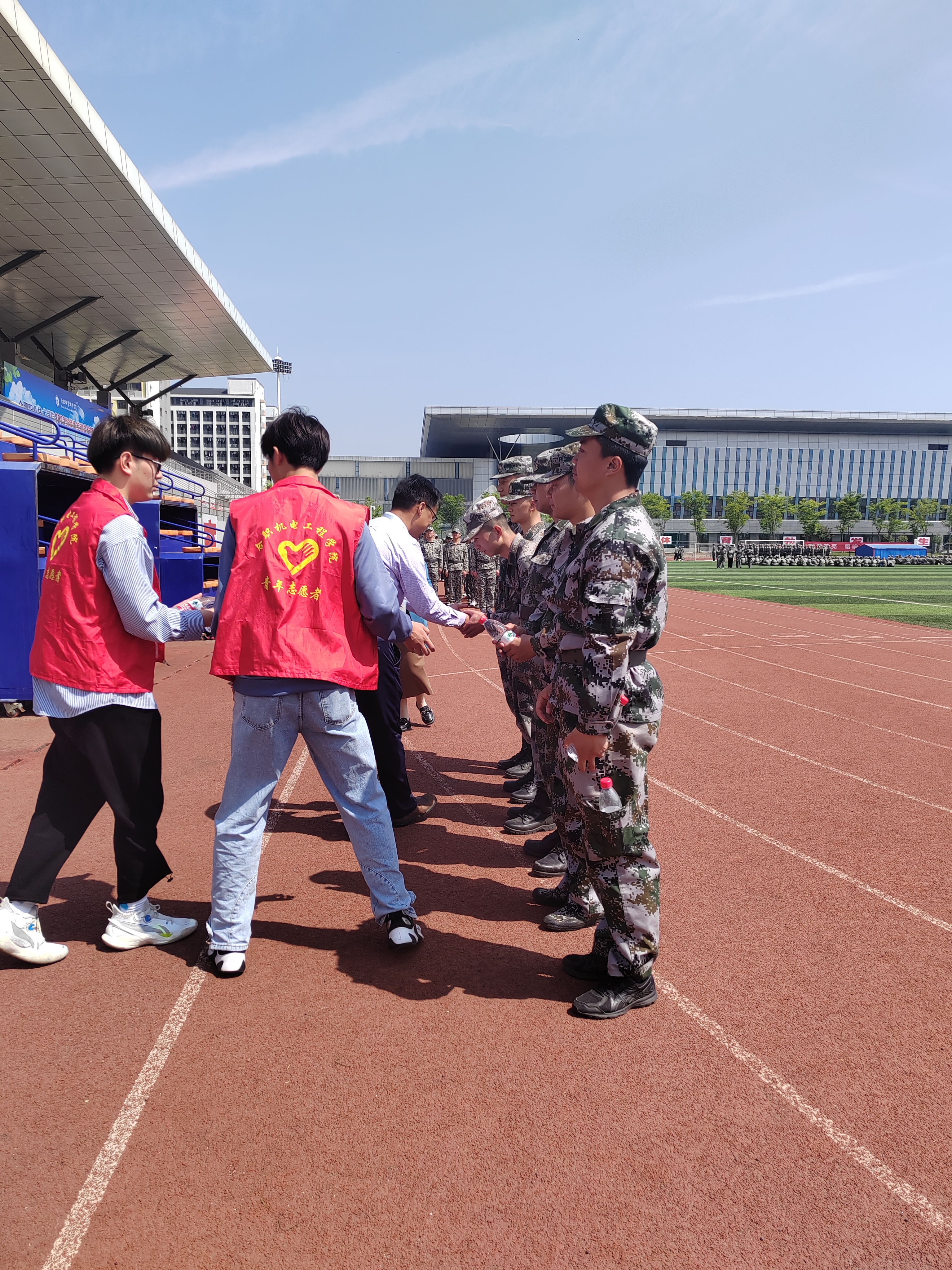 本次志愿服务中,在支部教师党员以及各位志愿者们尽心尽责地安排下,志愿工作进行得井然有序。队列点名、数据统计、物品归纳、校医院、宿舍......到处都有他们的身影。志愿者们准备了所需药品及急救物品,随时关注着军训人员的身体状况并及时给予帮助,处理突发紧急情况。身着红马甲的志愿者,在迷彩世界里格外地醒目。他们时刻关注着绿茵场上辛苦操练的同学们,及时伸出援手,耐心倾听同学们的需求,主动为同学们提供服务。