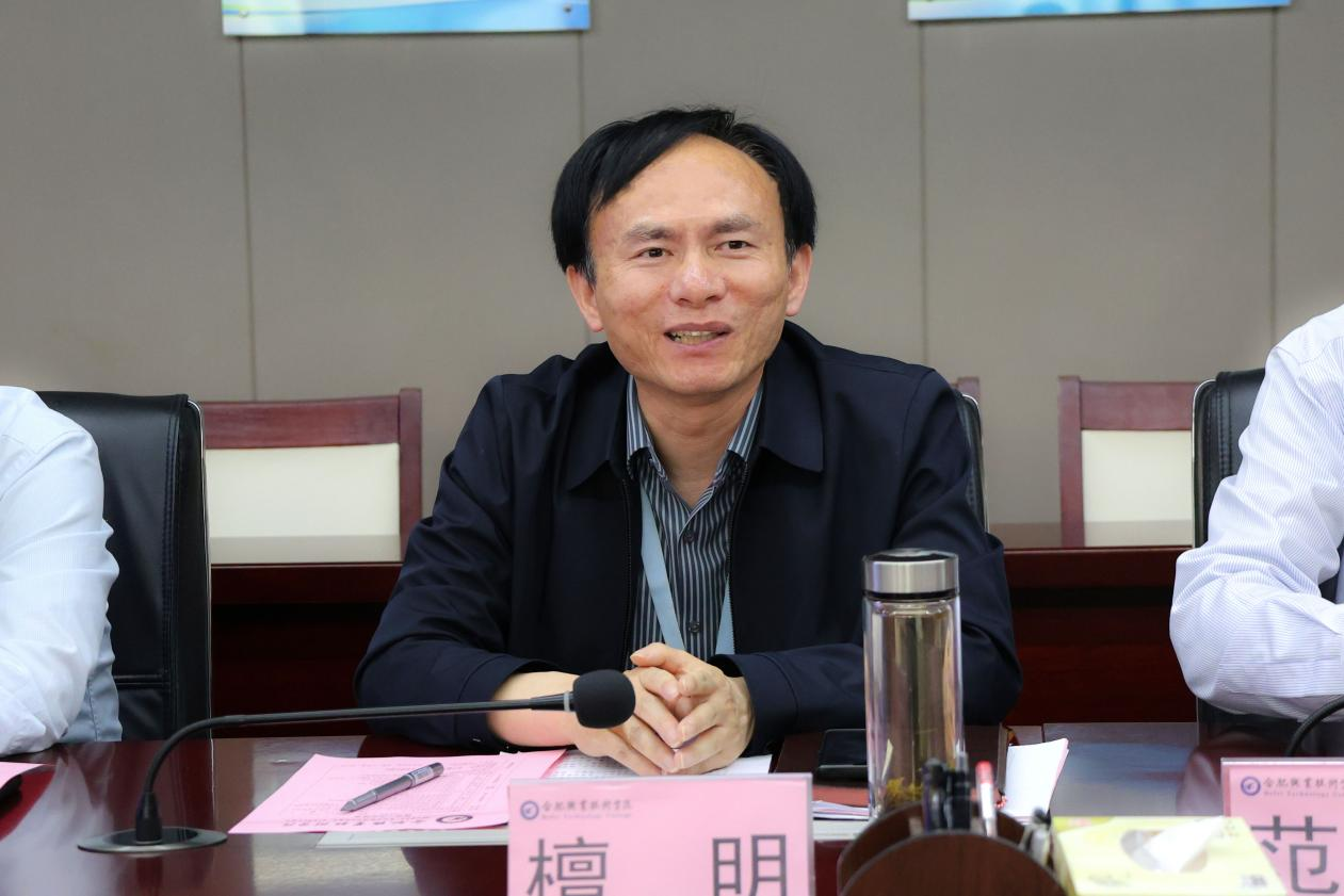 董事长檀明致辞。檀明首先代表学校对来访的嘉宾表示热烈的欢迎,对政府部门、企业方在合肥(新站)高新技术产教联合体、四大产教联盟等工作开展的支持表示感谢。檀明指出,此次政、校、企合作交流、校企合作签约暨人才培养基地授牌是聚焦推进产教联盟十三项重点任务,围绕现场工程师培养,实现校企协同育人实质性成果之一。檀明强调,学校对专业人才的培养,要契合合肥市、新站区产业发展,注重品牌效应,并期望以此次活动为契机,在政府指导下、企业协同下提升学校办学层次,在应用型科研团队、社会培训等方面进一步扩宽校企产学研合作深度与广度。