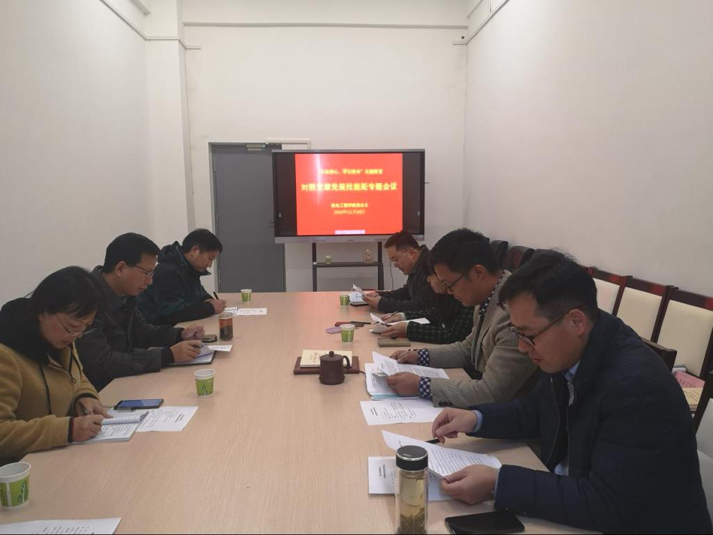 11月26日上午,机电工程公司党总支在机电楼二楼会议室召开对照党章党规找差距专题会议。学院总支委员参加了会议,学校“不忘初心、牢记使命”主题教育第七指导组组长王海、副组长丁怡琴、成员马恒彬、陈辛琦到会指导。会议由该公司党总支副书记(主持工作)王克勇主持。