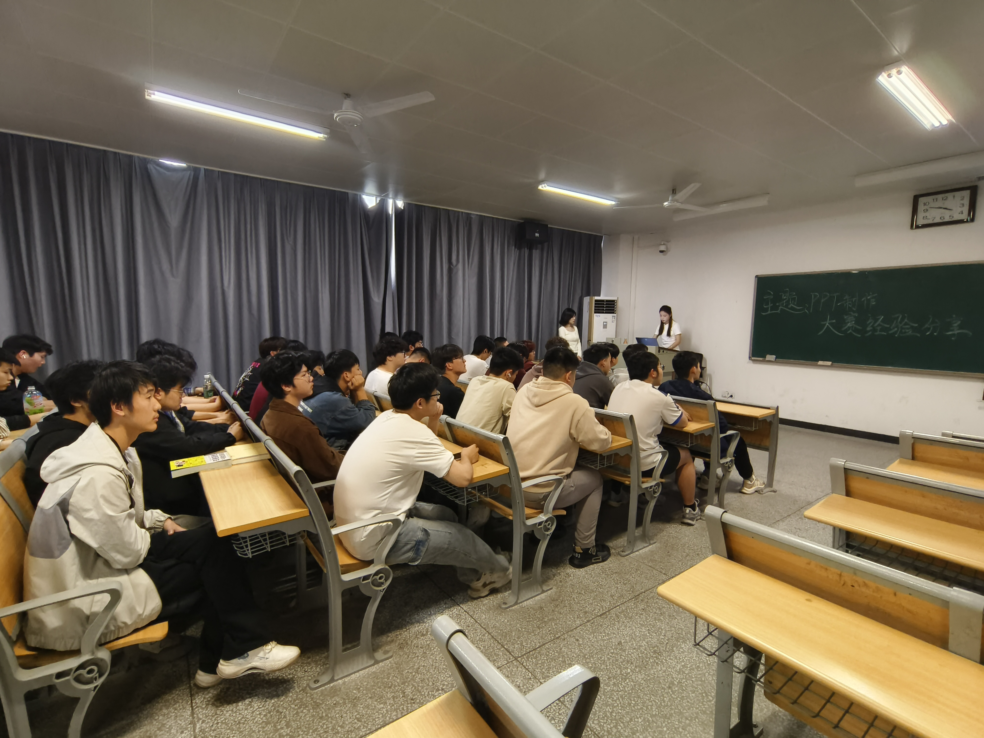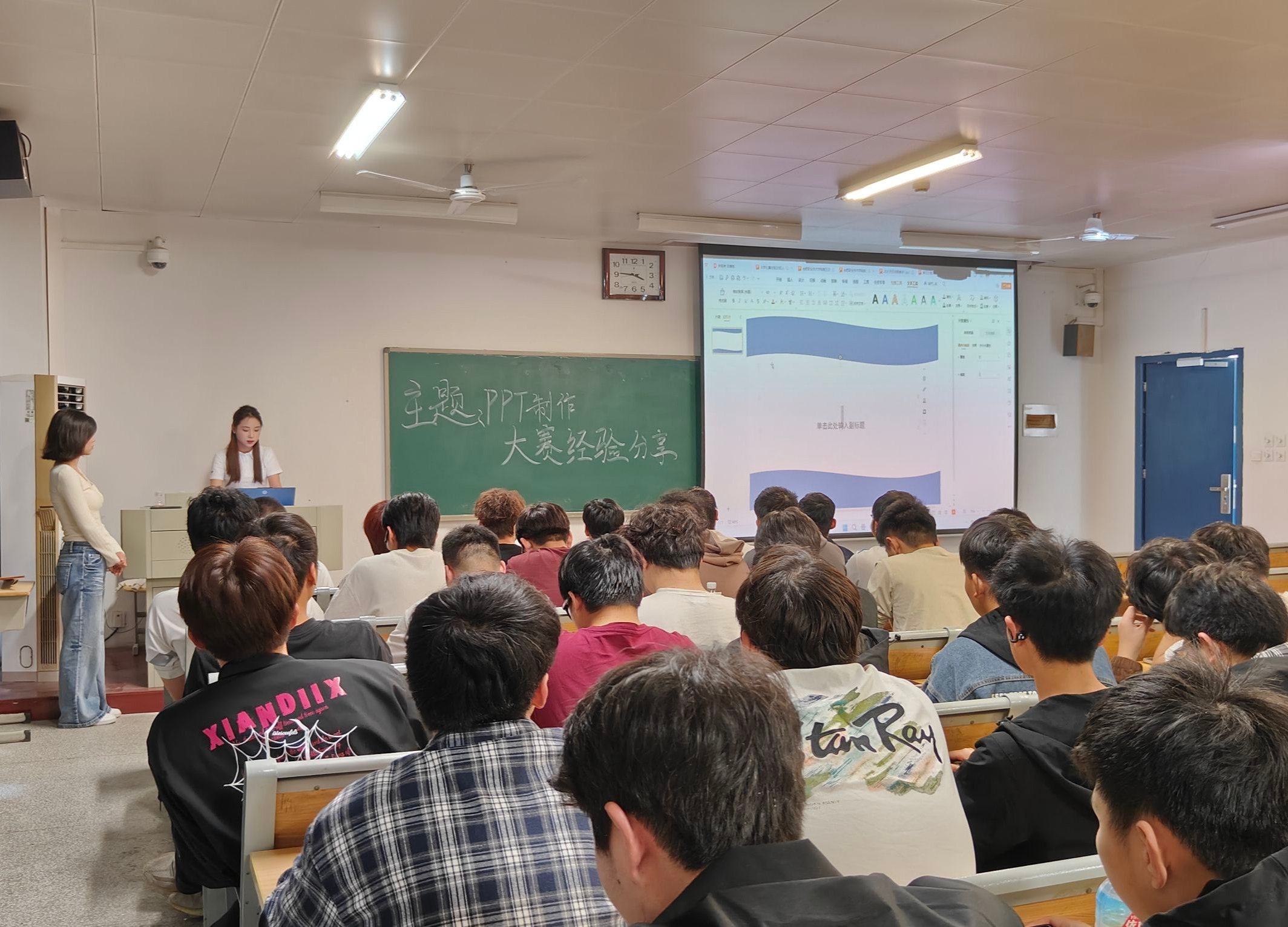 活动主讲人胡海燕、张琪同学围绕PPT制作的核心环节展开系统讲解。她们从“确定主题与内容”到“校对审核”,结合实例详细解析了如何精准定位受众、选择适配模板、设计简洁美观的页面布局,并强调动画效果的适度运用与内容逻辑的严谨性。现场通过AI展示了如何制作高质量PPT的案例,直观呈现了色彩搭配、字体选择及数据可视化的实用技巧,为同学们提供了非常实用的模板思路。
