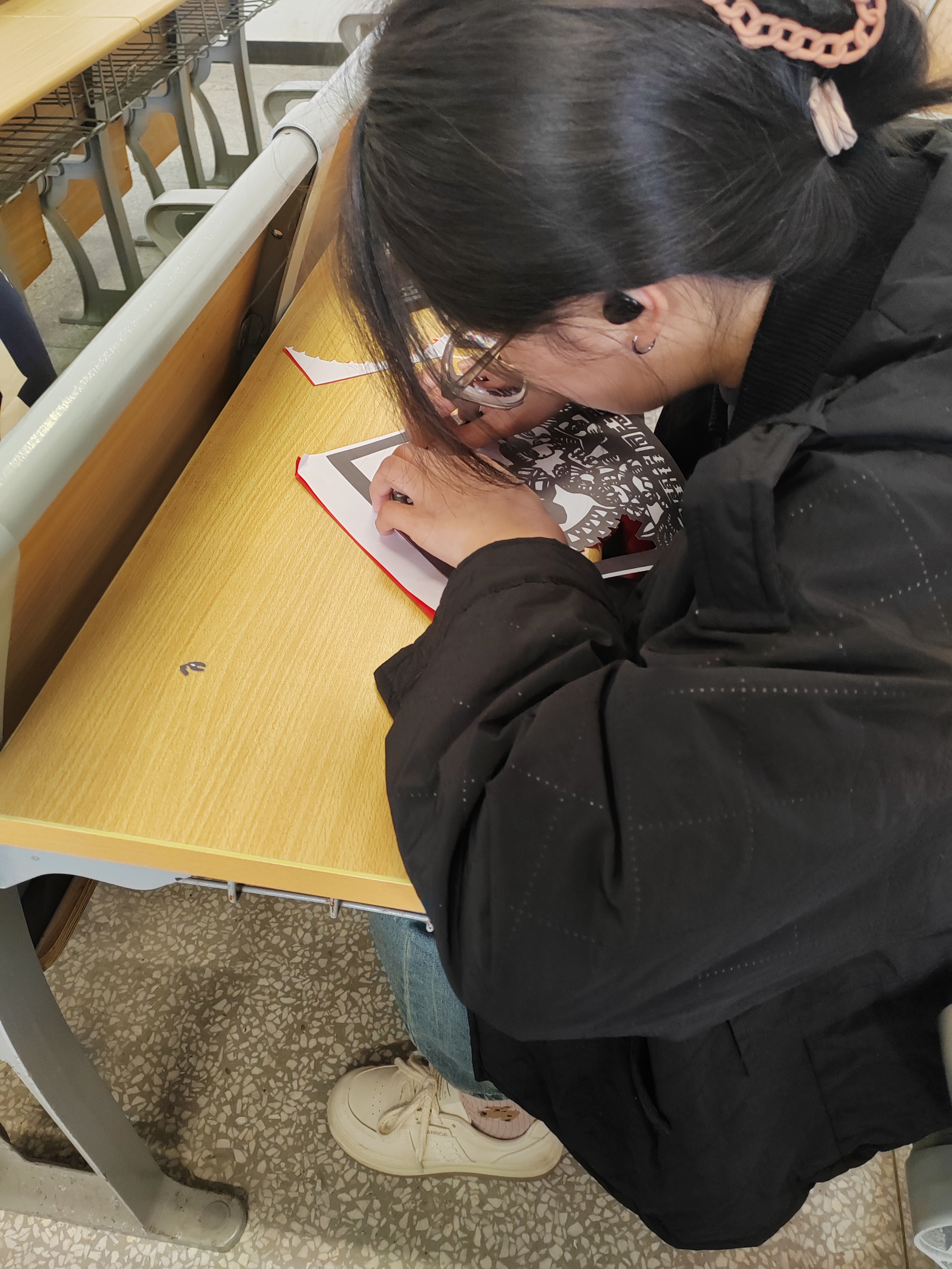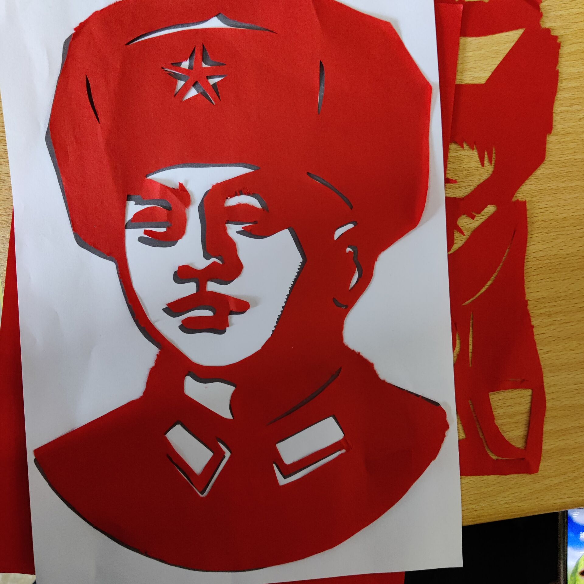 活动开始前,负责人介绍本次活动以及安排部门准备相关活动工具,大家认真的熟悉着剪纸的各个步骤以及剪纸技巧。活动过程中,同学们通过一把刻刀、一张红纸、一颗红心聚精会神地雕刻着作品。随着刻刀的起起落落,上下穿行,一张张普通的红纸,顿时变身成为一幅幅惟妙惟肖的雷锋肖像,雷锋同志光辉形象跃然纸上。