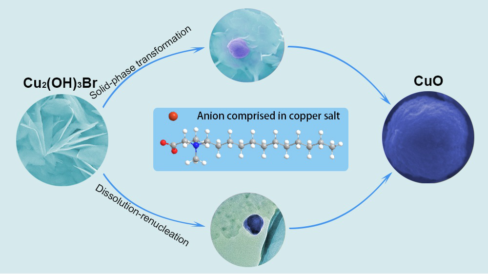英国上市公司365博士后研究中心是由公司微尺寸储能材料实验室与江苏省华威世纪电子集团有限公司博士后工作站合作建成的以研究储能材料相关理论及开发储能材料相关产品为目的的新型校企合作研发中心。在该中心最新相关工作中,以崔霞老师牵头的小组,打破了液相合成氧化铜的过程是由氢氧化铜单一消溶再成核的过程这一传统理念,巧妙利用该组自合成的长链季铵类羧酸盐,减缓了氢氧化铜向氧化铜转变的速度,使得反应能够可控分步进行。将分步产物借助高倍扫描、透射电镜等,清晰捕捉到氢氧化铜向氧化铜转变的不同过程,即:纳米氧化铜在液相反应过程中存在着固相转变与消溶再成核并存的现象。通过数据分析证明前人因无法减缓反应速度而忽略了固相转变的过程,借住小组自合成盐将为液相下氧化物转变理论的多元性提供重要证据。该项成果得到美国化学协会相关审稿专家认可,得以发表于该协会晶体类顶级期刊。这是该团队继发现氢氧化锌转变为氧化锌过程中存在这一特殊现象的基础上,再次在氧化铜类材料上得到了相同的验证。下一步,该团队还将继续利用自合成相关盐类扩展研究范围,为液相下制备不同储能类纳米材料的合成理论作出更多贡献。