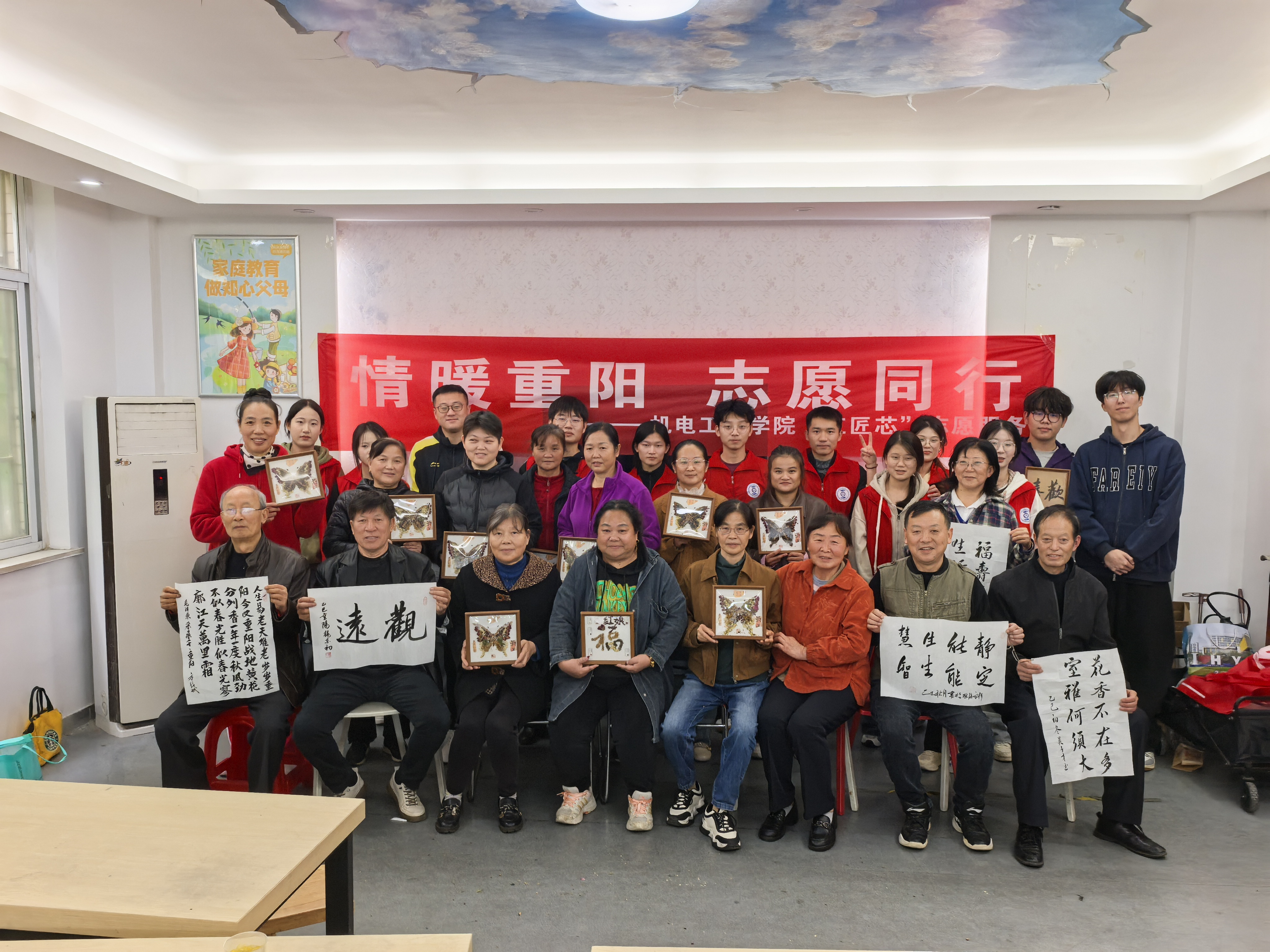 活动现场,志愿者与老人们一起动手制作非遗手工——中草药香氛画。志愿者们耐心讲解制作步骤,协助老人们挑选药材、搭配色彩、粘贴构图。有的老人小心翼翼地将艾草、菊花等中草药粘贴在画布上,不时询问志愿者是否贴得整齐;有的老人与志愿者一起讨论画面的意境,笑语盈盈,气氛温馨。另一边,几位热爱书法的老人挥毫泼墨,神情专注,一笔一画尽显功底。志愿者在一旁铺纸研墨,不时发出赞叹。一幅幅“福寿安康”、“重阳敬老”的毛笔字,不仅展现了老人们的精神风貌,也将传统文化的韵味传递给了在场的每一个人。