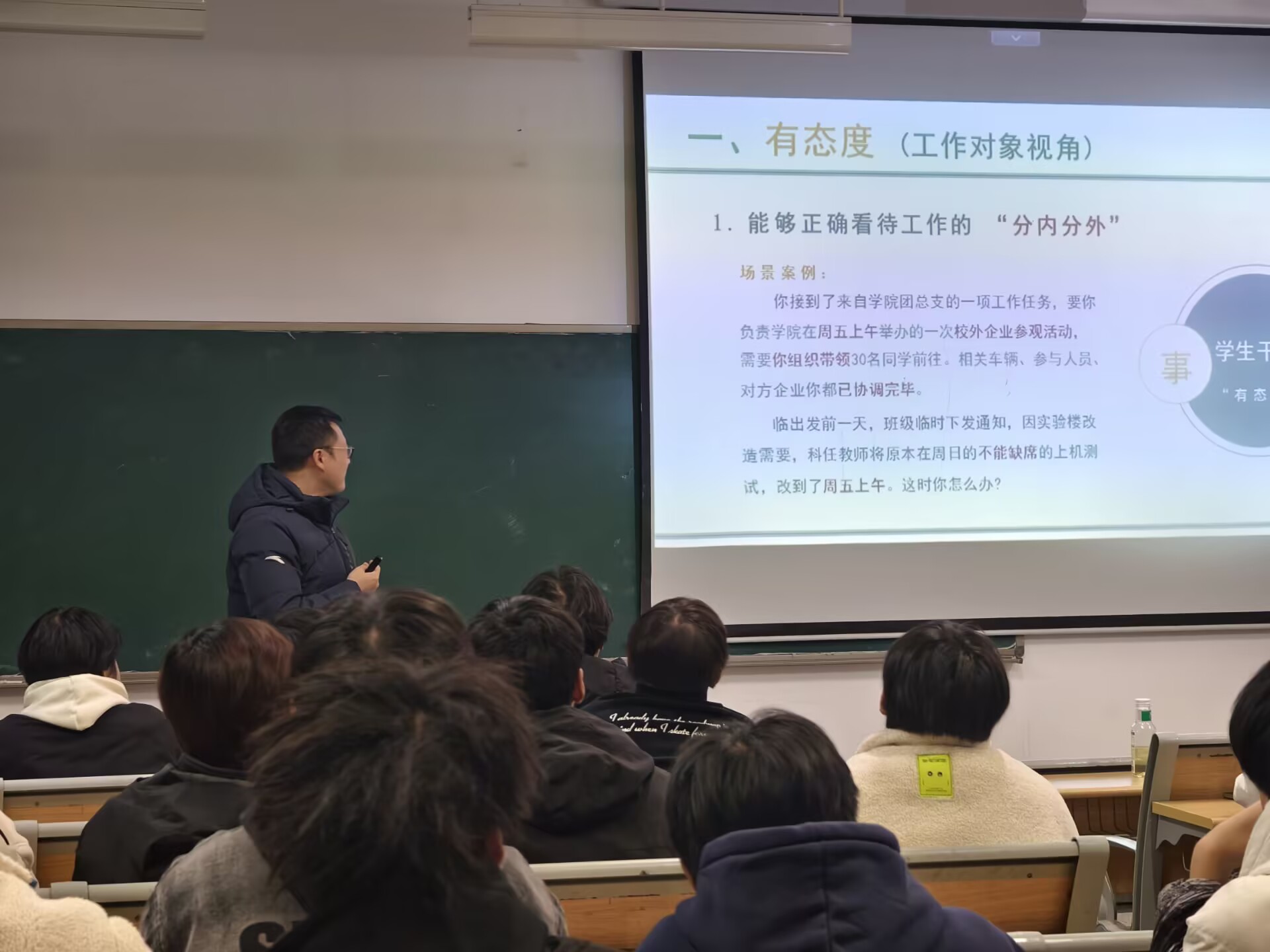 培训过程中,张开老师围绕“有态度、有思考、有能力”三大维度展开讲解。首先,“态度”是衡量一个员工干部发展潜力的重要指标。他强调员工干部应正确看待工作的“分内”与“分外”,在面对突发任务与学业压力时展现责任担当,并以实际案例引导同学们树立高标准意识,注重文稿撰写、文件整理等细节,做到严谨规范、精益求精。“思考”是个人能力迅速提升的重要途径。张老师通过“折纸游戏”“体育活动策划”等互动案例,引导员工干部理解“多汇报、善求助”的重要性,鼓励大家打破“以前都是这样”的思维定式,主动借鉴往届经验,提升工作效率与创新意识。同时,他结合自我评价与他人反馈的实例,帮助同学们掌握合理反思的方法,持续优化自身工作表现。“能力”是老师眼中优秀员工干部的重要素质。张老师重点讲解了员工干部应具备的三大核心能力:解读文字、沟通协调与活动组织。通过“通知撰写与发布”“嘉宾邀请确认”“运动会分工协作”等典型案例,他系统阐释了沟通礼仪与组织技巧,并鼓励大家善用团队协作与AI工具,提升工作效率,实现“智慧型”员工工作。