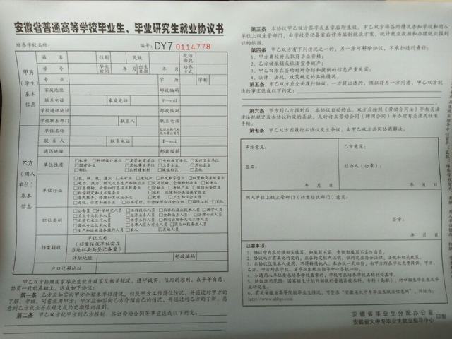 毕业生到辅导员(班主任)处领取“安徽省普通高等学校毕业生就业协议书”。