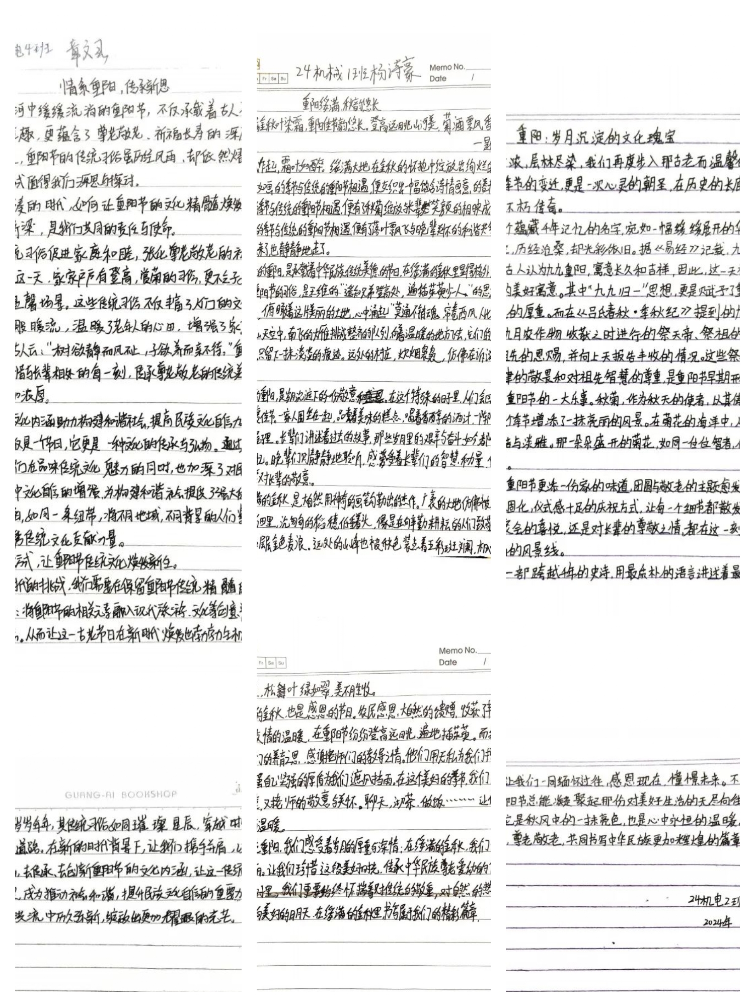 活动过程中,同学们还互相交流自己的写作心得,深入了解重阳节的历史渊源、文化内涵和节日习俗。经过初审、复审和老师评审,最终评选出,一等奖:24机械4班赵高强;二等奖:24机械2班赵超洁、24模具1班徐文宇;三等奖:24机电4班章文君、24机械1班杨诗豪、24机电4班高凯歌。获奖作品不仅文辞优美,更深入挖掘了重阳节的历史文化内涵,展现了当代青年在继承与发扬传统文化中的责任与使命感。活动结束后,获奖同学纷纷表示,通过参与此次活动,他们不仅对重阳节有了更深的认识,还在与老师们的互动与交流中,感受到了尊老敬老的重要性。